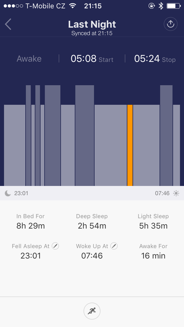 První noc mi náramek naměřil 8h17m spánku, z toho 2h14m hlubokého spánku. Jakým algoritmem se ten hluboký spánek počítá netuším, ale čas usnutí i probuzení přesně sedí. Průměrně spím 8 hodin denně, nejvíce času v hlubokém spánku jsem měl 3h 26m, jinak se to pohybuje mezi 2-3 hodinama za noc.
