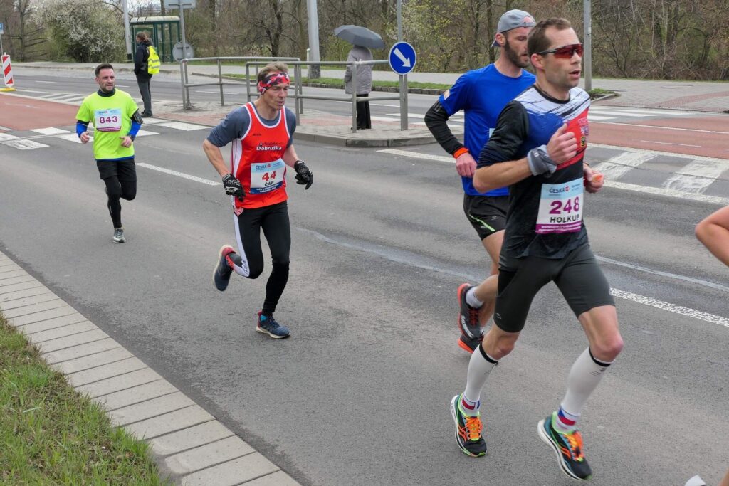 Na startu neskutečně moc kvalitních běžců, závod byl pořádan jako Mistrovství republiky v půlmaratonu, takže nechyběla česká špička s Homoláčem, Marčíkem, Pavlištou a těch ženskejch, co běželo přede mnou, to jsem nikde neviděl, taková kvalita, byl jsem tam fakt jen do počtu, velký balík asi 80 lidí rozbíhal přede mnou. Bylo s kým běžet dlouhou dobu, první kilometry jsem byl pěkně schovaný a trefoval jsem stranu, abych byl krytý po každé změně směru.