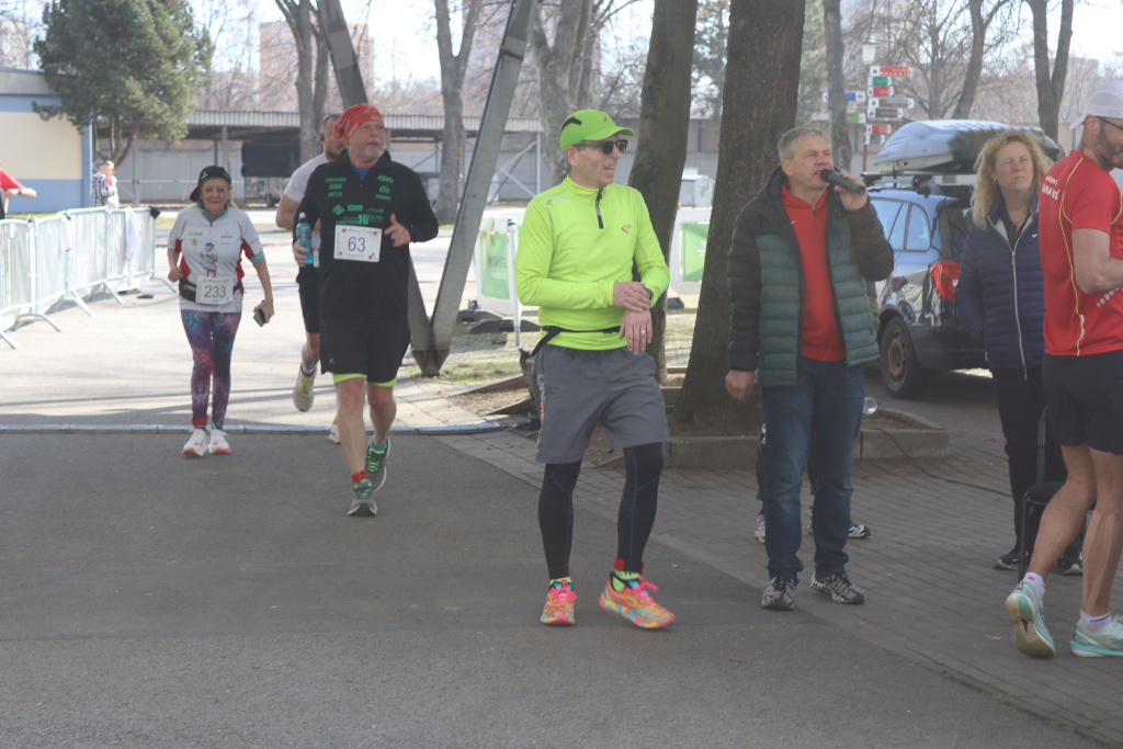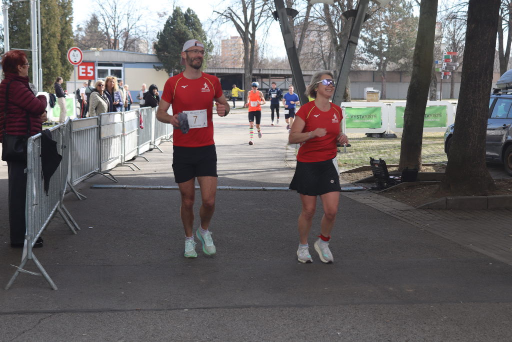 Zatímco maratonci kroužili už skoro dvě a půl hodiny na trati od 8:00, já se teprve rozklusával a fandil jsem Míše na prvním úseku naší půlmaratonské štafety. Bylo nás 10 štafet a v 9:30 společně s půlmaratonci začal náš závod. Užil jsem si fandění a pak došlo i na mě. Míša to rozběhla skvěle, prvních šest kol, převzal jsem si čip a s dvojitou dávkou motivace jsem vypálil do svých šesti kol. Trať 10,5 km jsem chtěl běžet v tempu 3:55/km, to je moje půlmaratonské tempo.