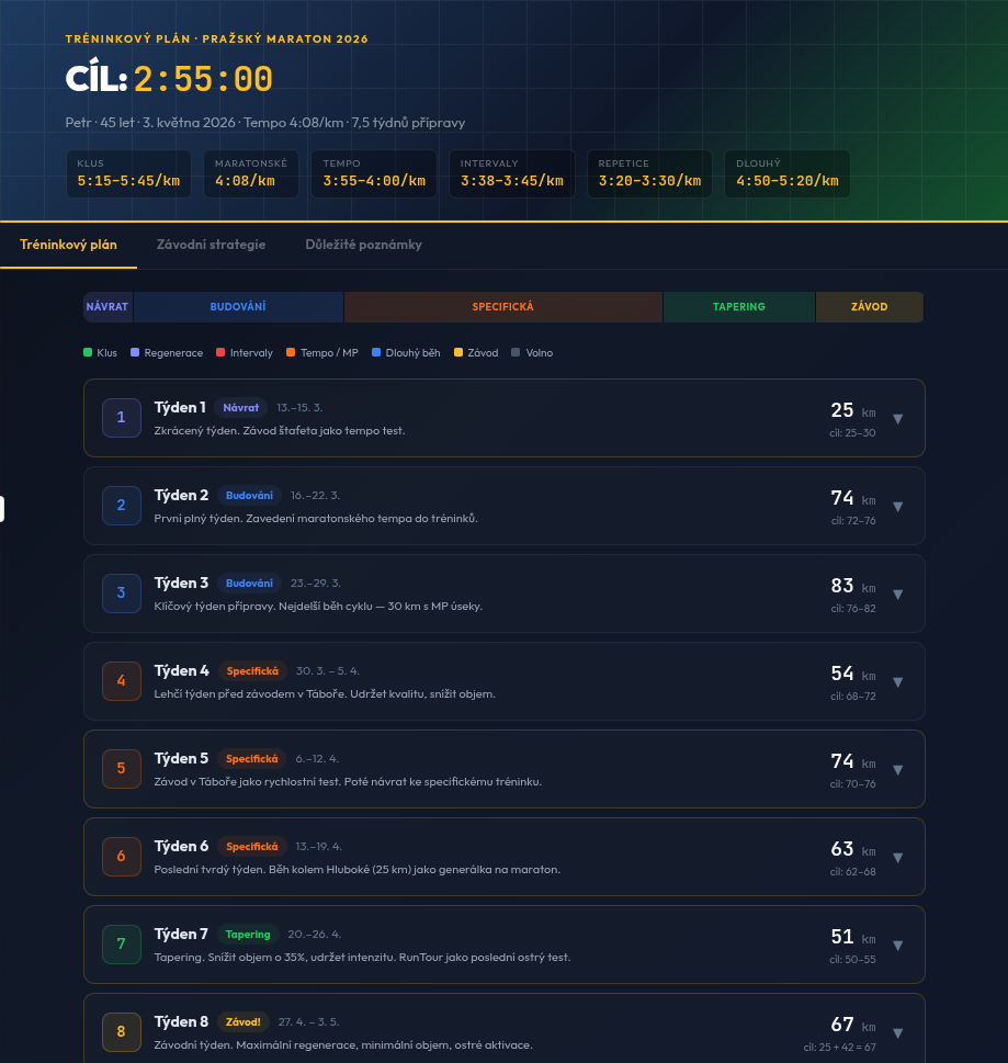 Vytvořil jsem si subdoménu Trenér https://trener.cvicko.cz/, kde mám zatím svůj profil a tréninkový plán. Profil je vytvořen na základě aktivit z Garmin za poslední rok + pár profilových údajů, seznamu plánovaných závodů a požadovaného cíle.
