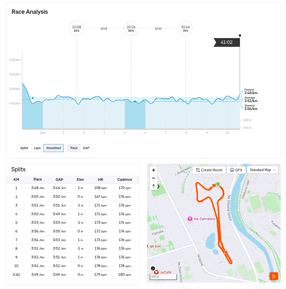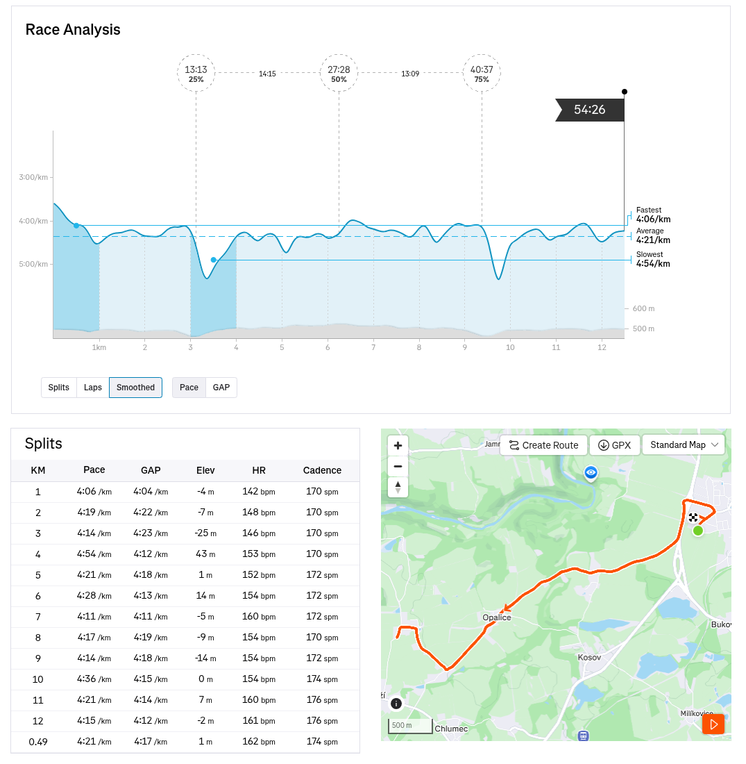 Běželo se mi krásně a moje tempo bylo po celý závod mezi 3:48-3:56/km, žádný problém, žádná krize. Desítku jsem měl za 38:40. Tempo 3:52/km. To je naprostá bomba s ohledem na můj trénink v posledních měsících.