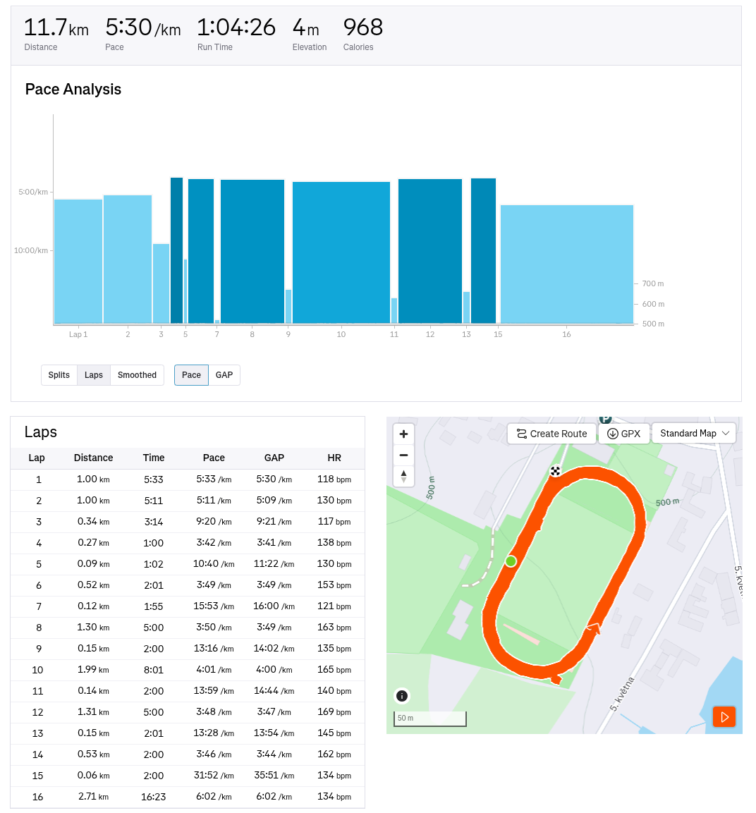 Skvělý trénink, zase po týdnu ovál, odběháno celkem 4 km v tempu 5k.