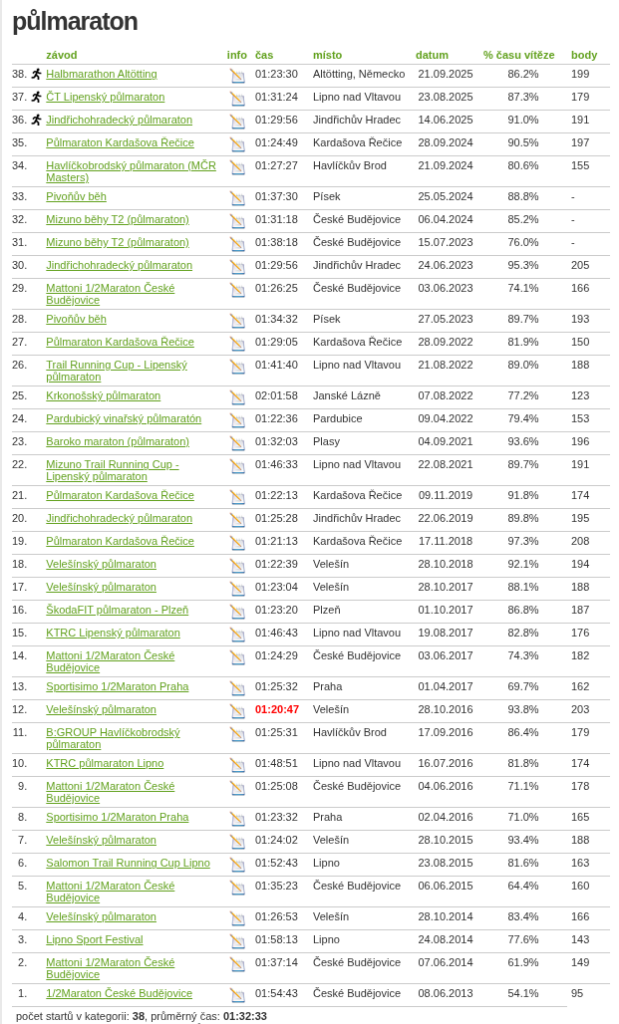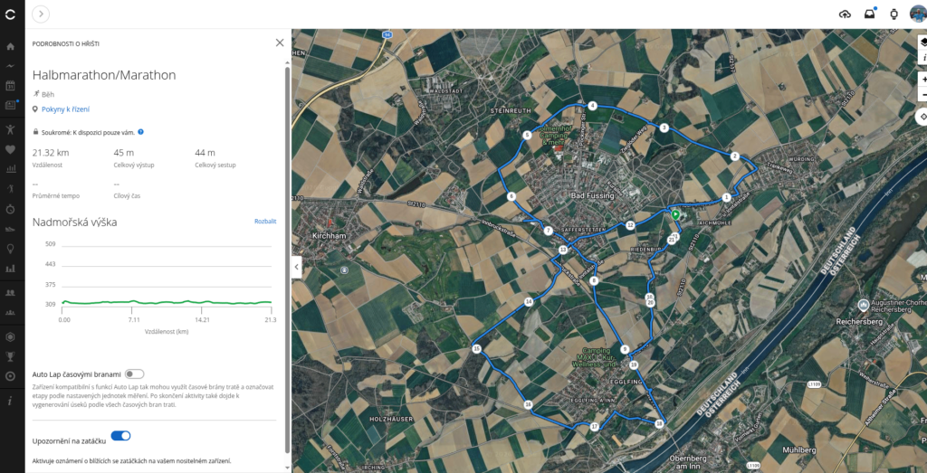 Na neděli to vypadá u mě zatím na půlmaraton, ale klucí chtějí dát celý maraton a mě to děsně moc láká běžet s nima, i když je to totální kravina 😀 Láká mě překonat čas 1:23:30 3:57/km z Altottingu, podmínky budou ideální (teplota kolem nuly narozdíl od 26˚C). Trať v Bad Fussingu je rychlá, rovinatá, certifikovaná. A v případě zaběhnutí cílového času by tam byla i šance na bednu v M45, loni stačil čas 1:22, předloni 1:24. Sice je to s ohledem na můj výpadek kvality v posledních dvou týdnech sci-fi, ale před tím výpadkem jsem si věřil i na lepší čas, tak proč to nezkusit.