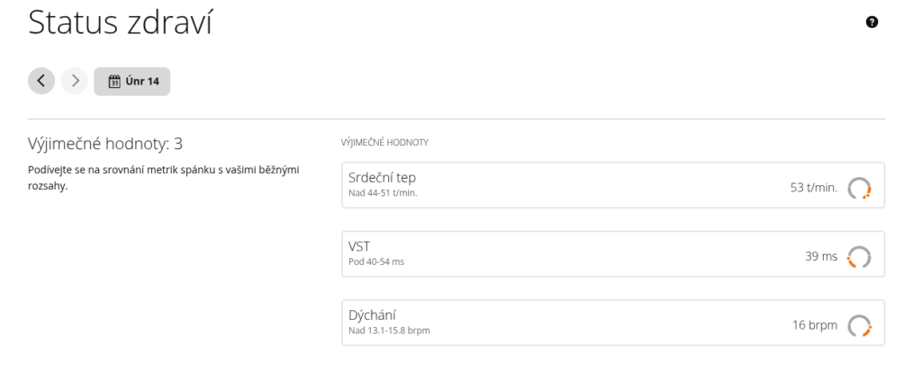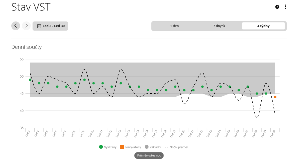Variabilita srdečního tepu mimo rozsah. Nervový systém je unavený, jsem přetažený. Brajgl mi tam udělal ten úterní noční alkohol a čtvrteční posilka večer. Když nepiju a neposiluju, tak je VST vyvážené 😀