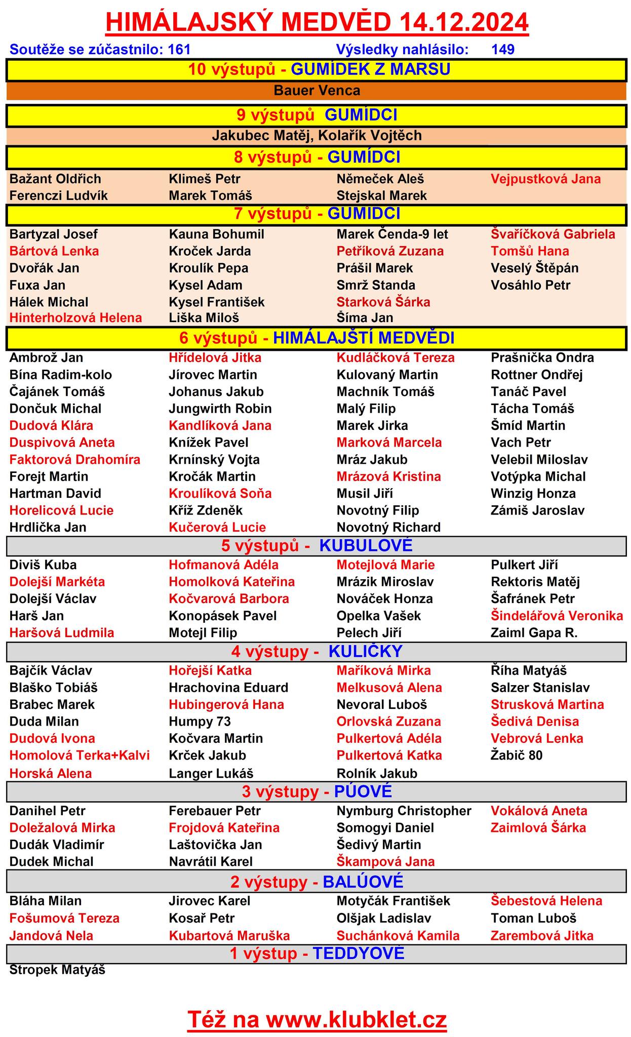 Jinak nejvíce výstupů muži – Václav Bauer 10 výstupů, ženy Jana Vejpustková 8 výstupů. 9 výstupů dal Vojta Kolařík, Matěj Jakubec a nevím, kdo další. To jsou většinou lidi, co běhají LHUT, B7 apod.. Asi nejméně 5 lidí dalo 8 výstupů. Ofic,.výsledky bývají tak do 14 dnů.